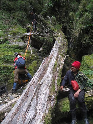 限了,就這樣亦步亦趨,右腳拖著左腳慢慢橫過僅能容一人的倒木。